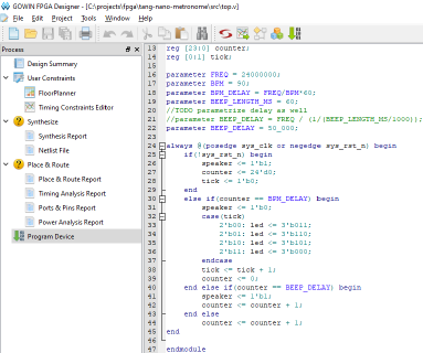 I ported the metronome design to Altera Cyclone IV using Quartus, as I was mostly interested in the efficiency of the synthesizer and wanted to compare the resulting resource usage. Both the GW1N-LV1QN48C6/I5 and EP4CE6E22C8 feature 4-LUT architecture, so the usage should be roughly the same.